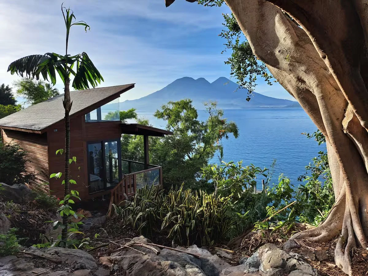 Casa Tabebuia is a peaceful lakeside retreat tucked along the tranquil shores of Lake Atitlán in beautiful Pasajcap Bay, between the villages of Tzununa and San Marcos La Laguna. Accessible only by boat, this off-the-grid sanctuary offers a truly secluded and immersive nature experience while still providing comfort through solar electricity and a gas stove. The property features two identical private bedroom casitas, each with two full beds, an ensuite bathroom with hot shower, and its own deck overlooking the lake; perfect for enjoying sunrise views, the sound of the water, and the surrounding volcanoes. Guests also enjoy direct access to a shared lakefront, ideal for swimming, relaxing, and reconnecting with the natural beauty of Atitlán.